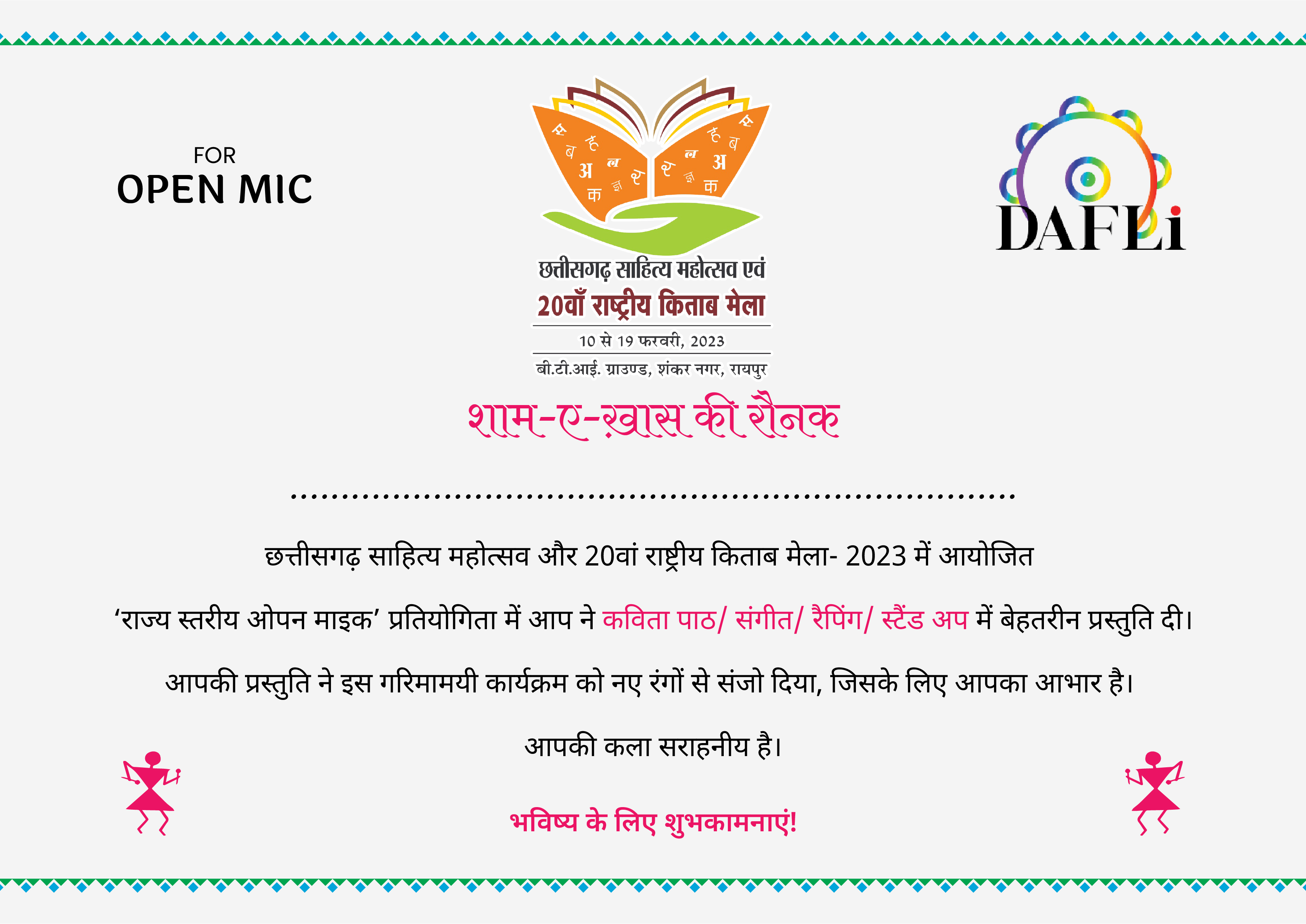Chhattisgarh Sahitya Mahotsav approached us to create a visually engaging environment that reflects the richness of the region’s literary and cultural heritage. We designed a cohesive event identity that brought the festival’s essence to life through thoughtfully crafted visuals. From event stalls and standees to certificates and other on-ground elements, every design balanced cultural depth with a clean, professional aesthetic. This event design approach enhanced the overall festival experience, helping the Mahotsav connect more strongly with its audience while celebrating the literary spirit of Chhattisgarh.